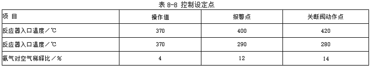 (2)氨儲存供應系統(tǒng) 計量的氨氣可依溫度和壓力修正系數(shù)進行修正。從煙氣側(cè)所獲得的no,信號饋入有計算所需氨氣流量的功能。控制器利用氨氣流量控制所需氨氣,使摩爾比維持固定。氦氣供應管線上有一個緊急關(guān)斷裝置,當入口煙氣溫度過低、過高或氨空氣稀釋比過高時,均與該裝置連鎖,迅速關(guān)斷,以確保操作安全和防止催化劑損壞。最初設(shè)定點見表8-8。