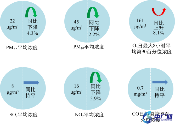 5月,全國339個地級及以上城市PM2.5平均濃度為22微克/立方米,同比下降4.3%;PM10平均濃度為45微克/立方米,同比下降2.2%;O3平均濃度為161微克/立方米,同比上升8.1%;SO2平均濃度為8微克/立方米,同比持平;NO2平均濃度為16微克/立方米,同比下降5.9%;CO平均濃度為0.7毫克/立方米,同比持平。